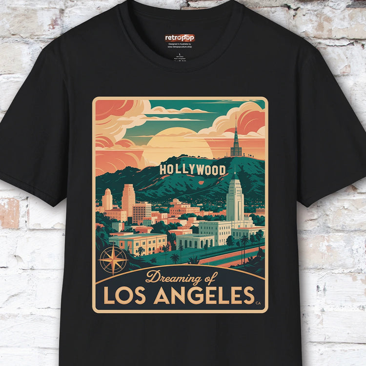 Capture the magic of the city that never sleeps with this vintage-style Dreaming of Los Angeles T-shirt from Retro Pop Culture. Featuring a nostalgic skyline design with retro color tones and classic art deco flair, this tee is perfect for dreamers, travelers, and Los Angeles lovers alike.